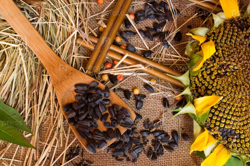 Солома, семена, подсолнечника семена на мешковины