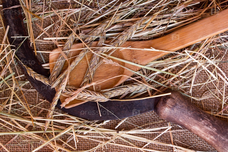 Серп и колосья пшеницы на мешковины