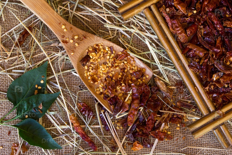 Деревянной ложкой, сушеная дробленая красный перец и целом сушеный перец на фоне мешковины