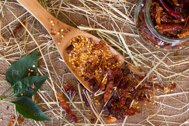 Деревянной ложкой, сушеная дробленая красный перец и целом сушеный перец на фоне мешковины