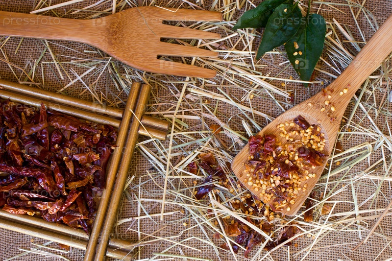 Деревянной ложкой, сушеная дробленая красный перец и целом сушеный перец на фоне мешковины