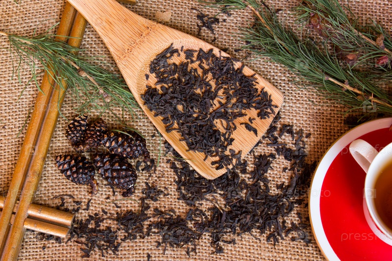 Выстрел из сухой черный чай с сосновыми ветками, Кубок на фоне мешковины