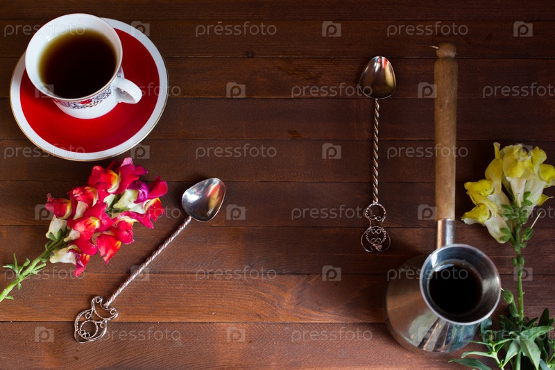 Джезве, чашка, ложка на фоне темного дерева