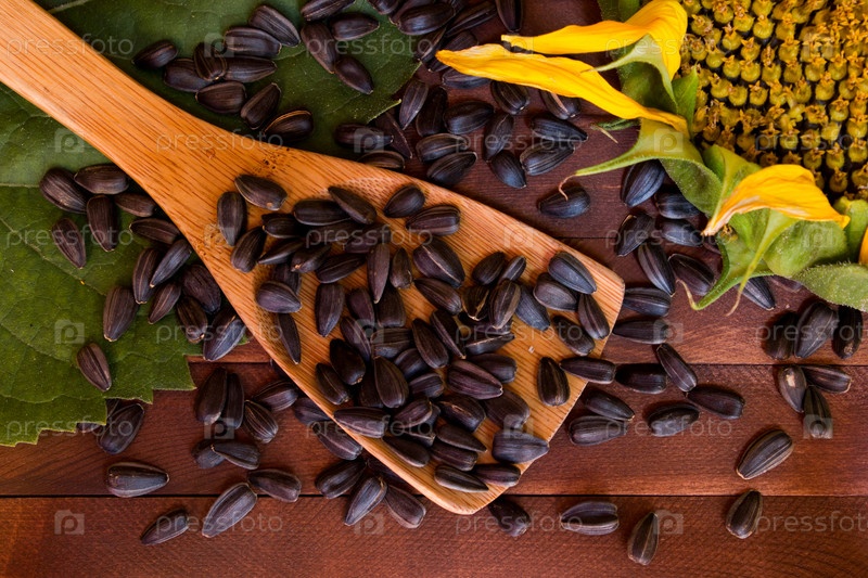 Подсолнух и семена на деревянном фоне