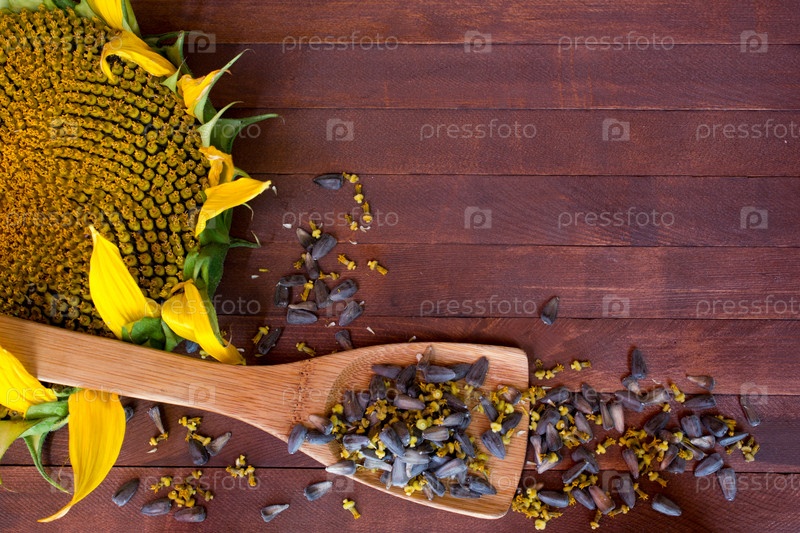 Подсолнечное и семена на деревянных фоне