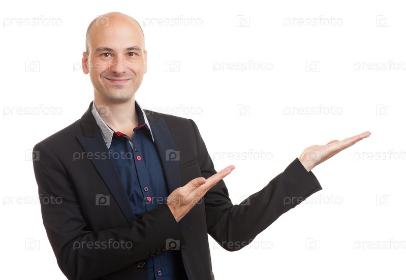 Улыбаясь лысый человек, представив свой текст или продукта