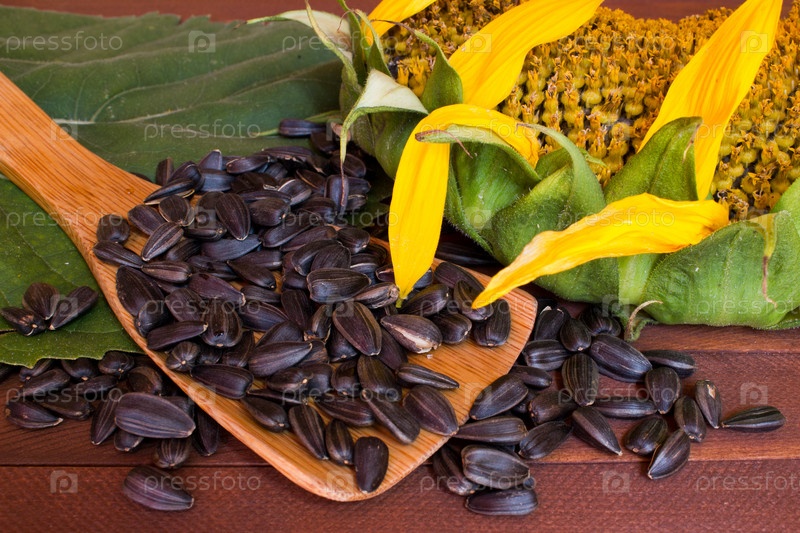 Подсолнечное и семена на деревянных фоне
