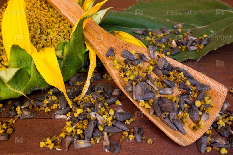 Подсолнечное и семена на деревянных фоне