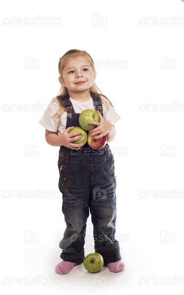 Маленькая девочка играет с яблоками