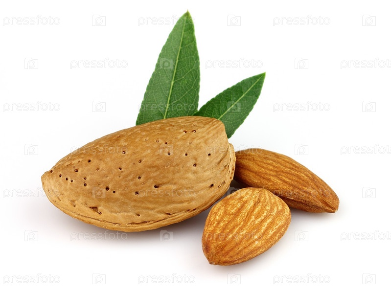 Ядра миндаля и целый миндаль с зелеными листьями на белом фоне