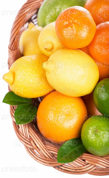 Цитрусовые фрукты с листьями в плетеной корзине
