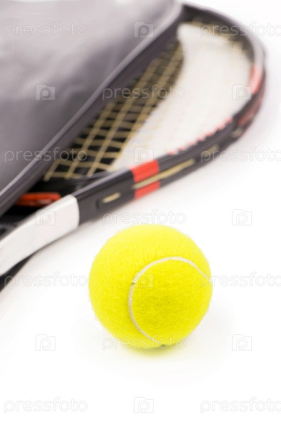 Теннисный мяч и ракетка на белом фоне