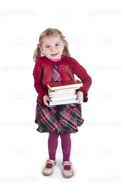 Маленькая девочка в очках держит книги