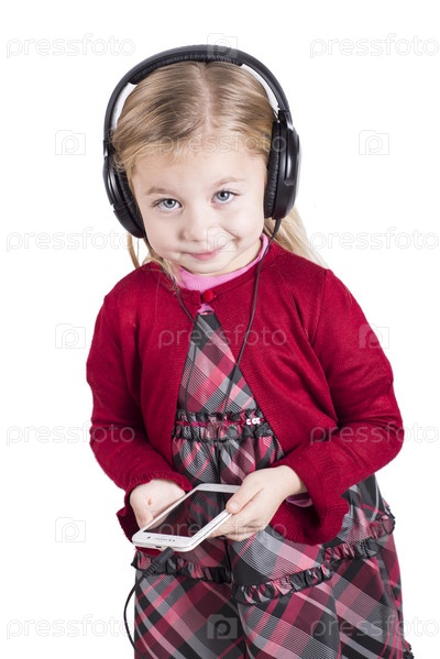 Блондинка девочка, улыбаясь, слушать музыку