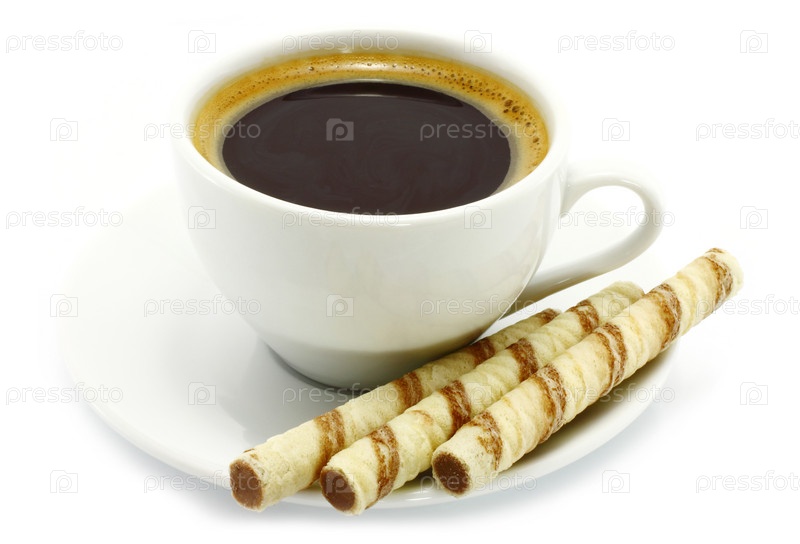 Чашка кофе и сладкие трубочки на белом