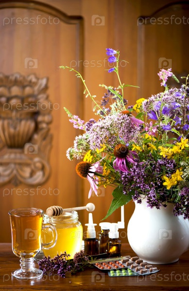 Натюрморт из лекарственных трав, мед, травяной чай и лекарства