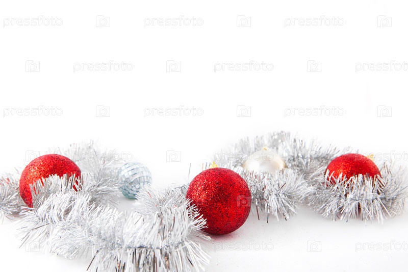 Красные шары на серебряной мишурой. Изолированные на белом