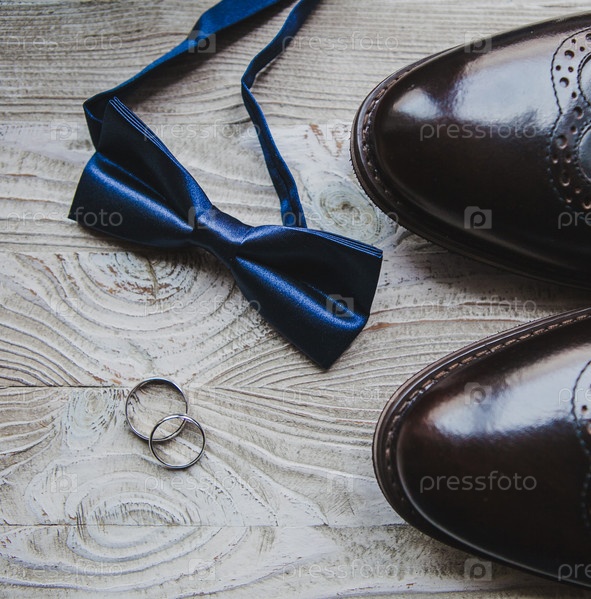 Закрыть детали свадьбы, кольца, женихи лук галстук и обувь