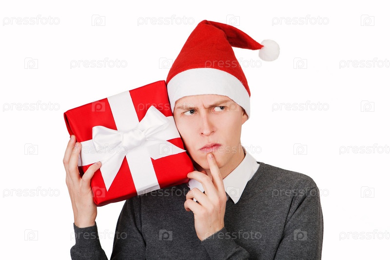 Любопытная(ый) человек шляпе Санта и проведение для Рождество