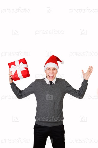 Человек взволнован счастливой улыбкой держать в руке подарочной коробке