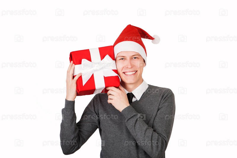 Любопытная(ый) человек шляпе Санта и проведение Рождественский подарок