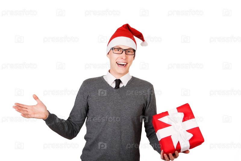 Деловой человек представляют красный Подарочная коробка с белой лентой лука