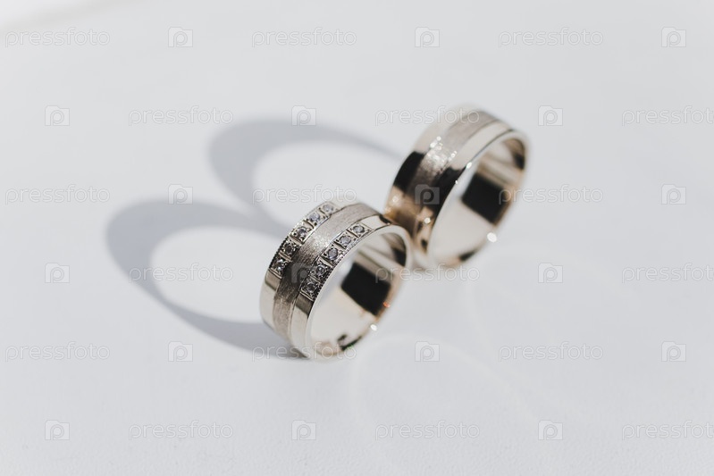 Два обручальные кольца с бриллиантами, лежа на белом столе