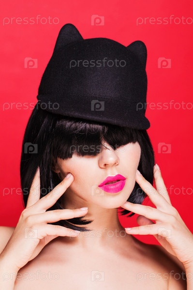 Женщина в шляпе кота. Крышка с ушами животного. на красном фоне