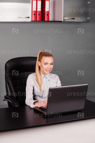 Счастливый молодой предприниматель, набрав на ноутбуке в ее бюро