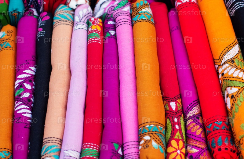 Ассортимент различных красочных индийских тканей на рынке