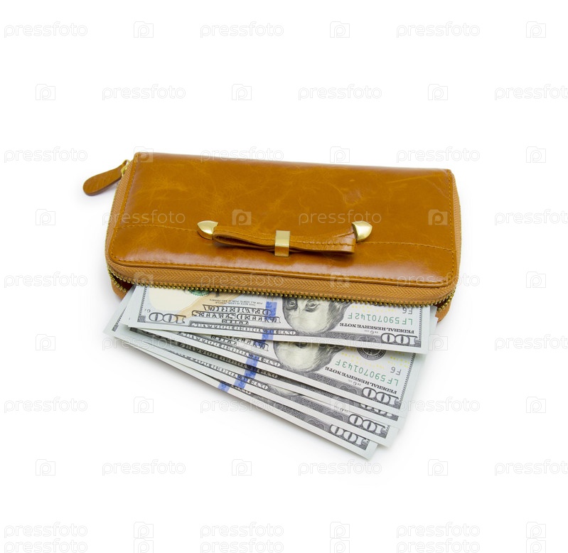 Кошелек с стодолларовую банкноту, изолированные на белом фоне вырез