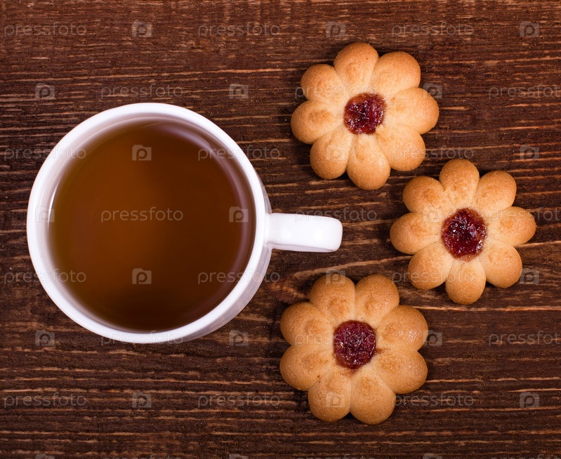 Чашка чайная с сладкий печенькой на деревянных фоне