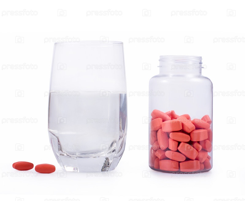 Бутылка таблеток и стакан воды