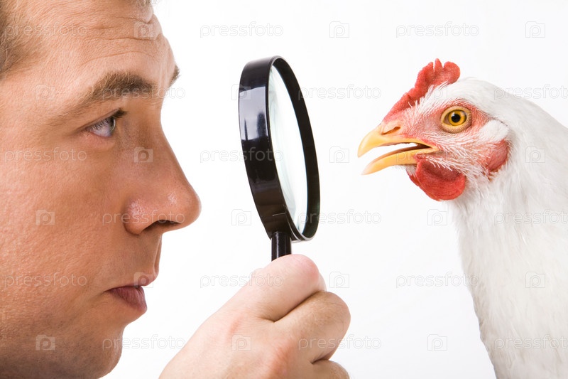 Близкие профили мужчины и курицы, смотрящих друг на друга через линзу у мужчин