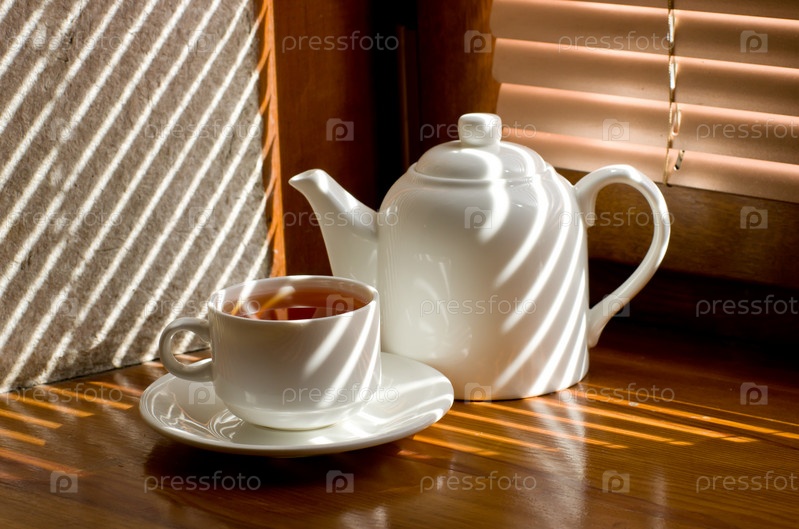 Чашка чайная с чайник на фоне жалюзи