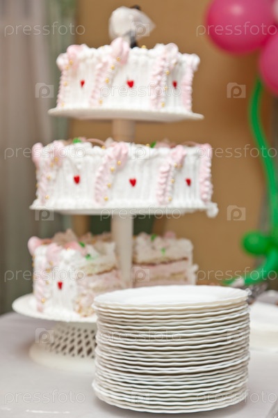 Стопка белых тарелок на фоне свадебного торта