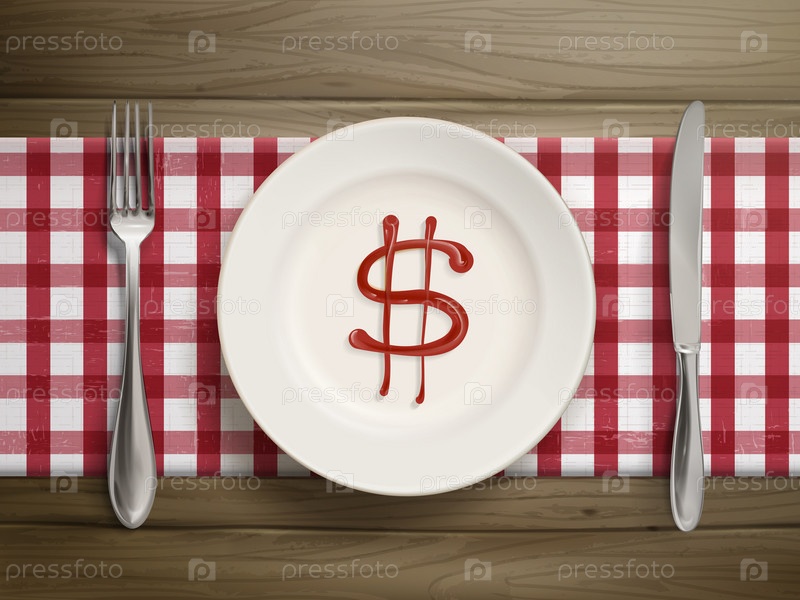 Символ денег, запряженной кетчупа на тарелке