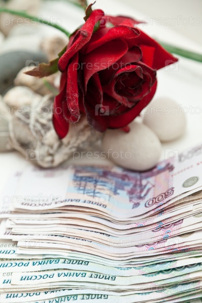 Деньги, подаренные на свадьбу. Банкноты и красная роза