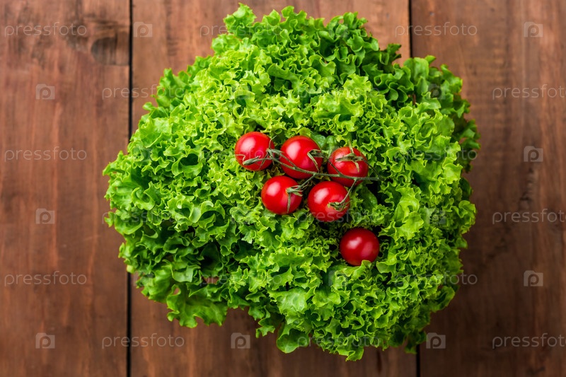 Салат и помидоры Черри на фоне дерева