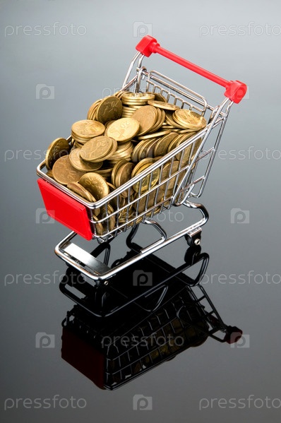 Магазинная тележка с золотыми монетами