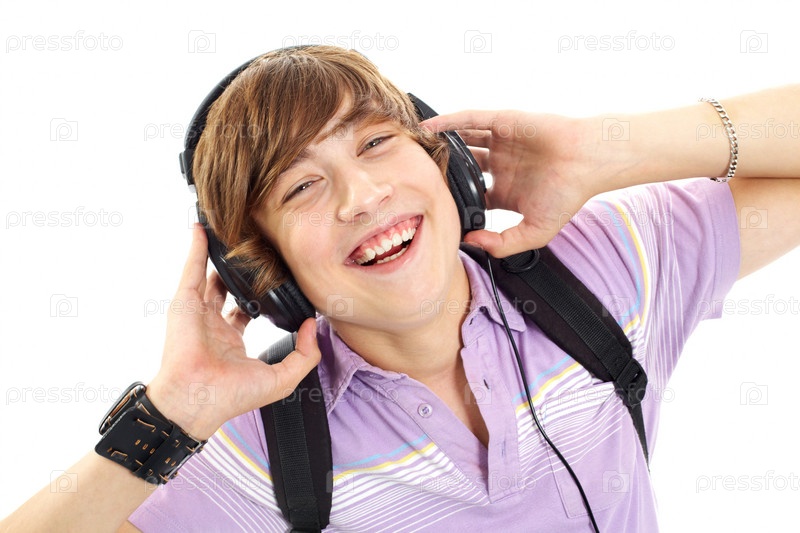 Юноша с наушниками на белом фоне