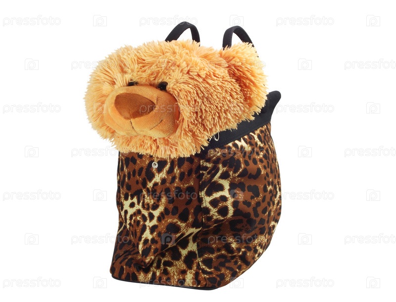 Мягкая игрушка в сумке на белом фоне