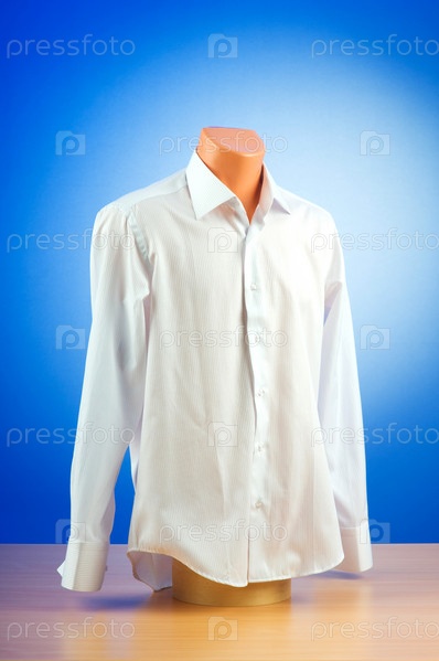 Белая мужская рубашка на манекене, синий фон