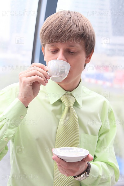 Молодой бизнесмен пьет кофе у окна офисного здания