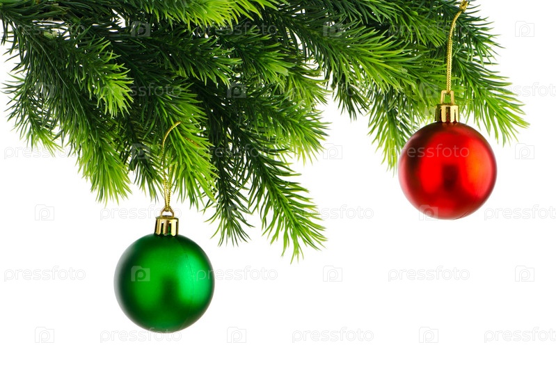 Два новогодних шара на елке, белый фон