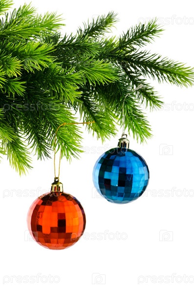 Два новогодних шара на елке, белый фон