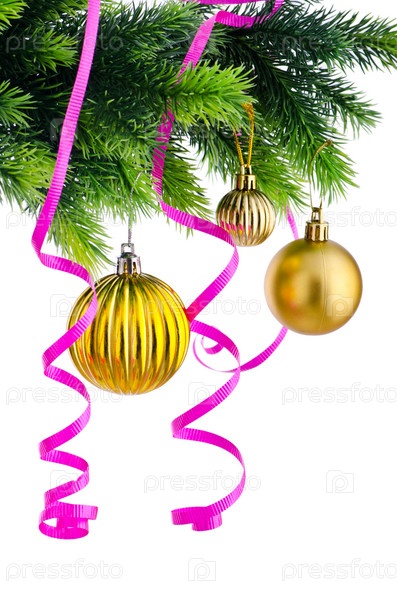 Три желтых новогодних шара и розовые ленточки на елке, белый фон