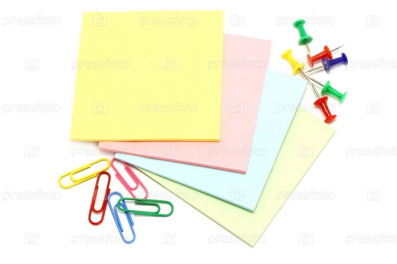 Листы для записи, канцелярские кнопки и скрепки крупным планом
