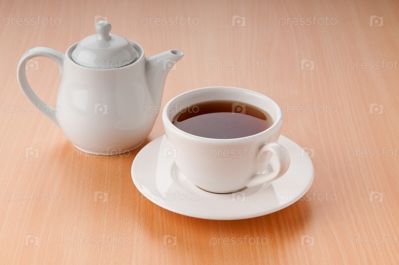 Чайник и чашка чая на деревянном столе