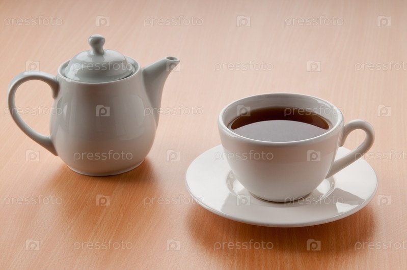 Чайник и чашка чая на деревянном столе